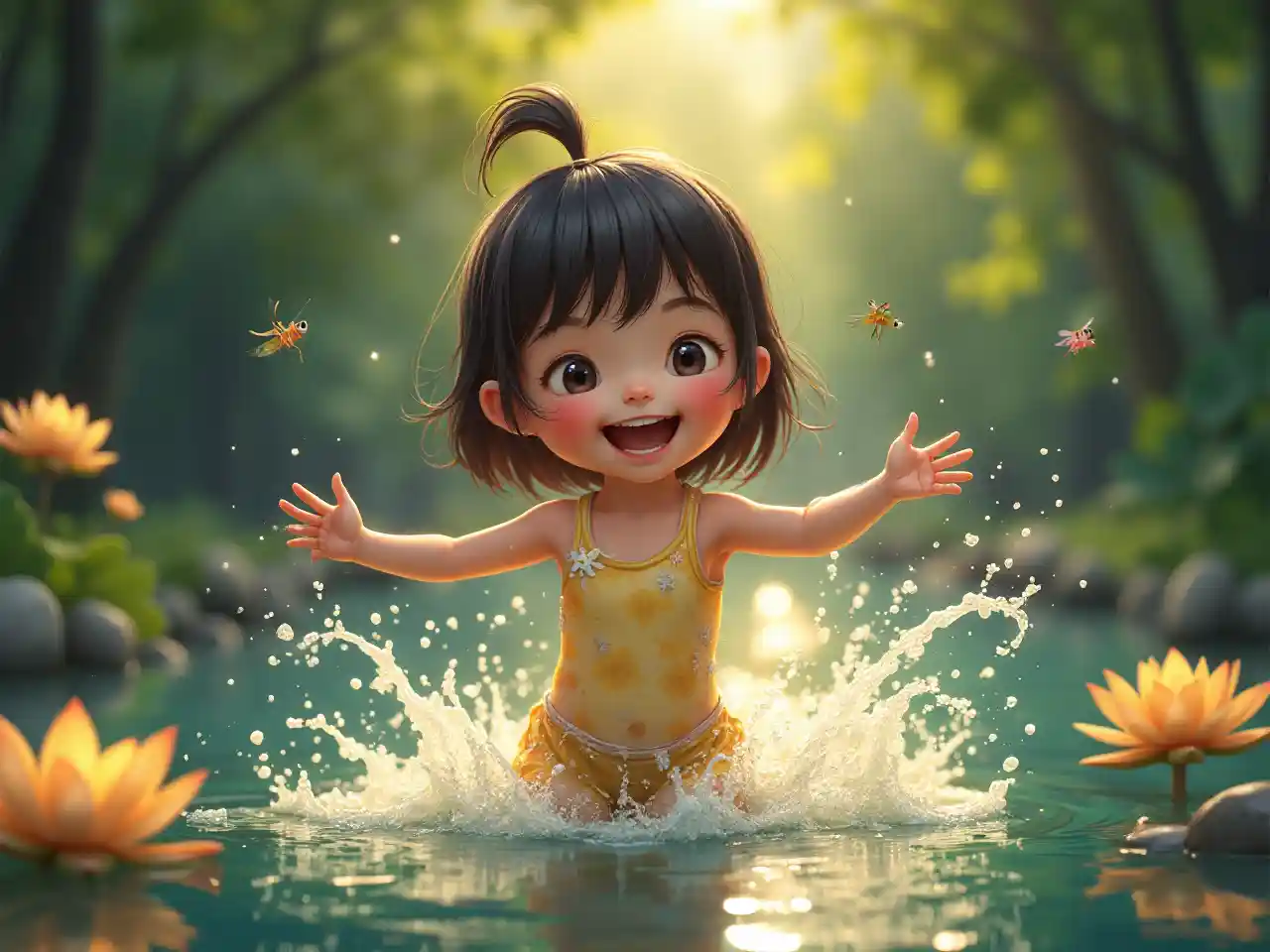 Splashing in a glowing stream, a 5-year-old Asian girl with bangs wears a swimsuit with starfish charms. Fireflies and lotus flowers frame her, her gleeful splashes radiating joy and carefree wonder in a magical, natural setting.