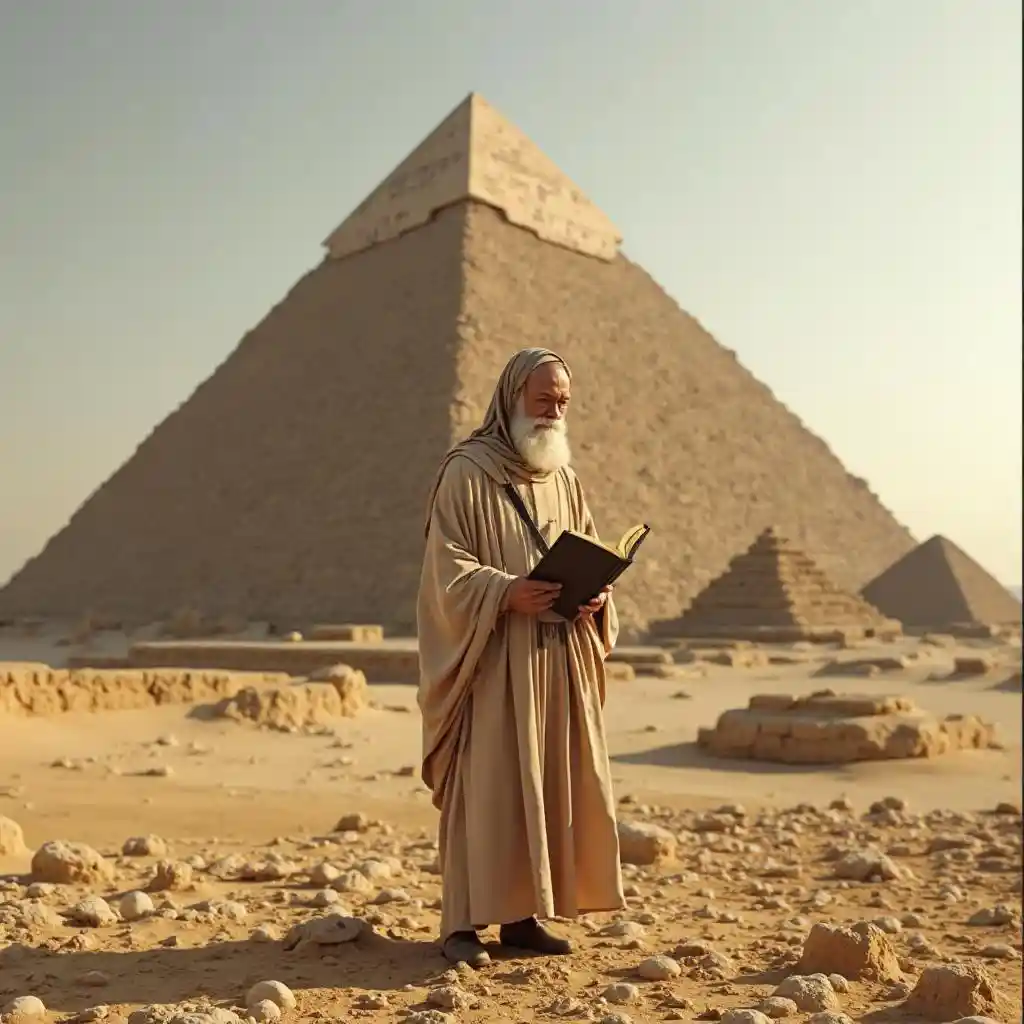 Pyramid of Giza and a prophet with a book standing in front of it, keep the face of the old prophet hidden