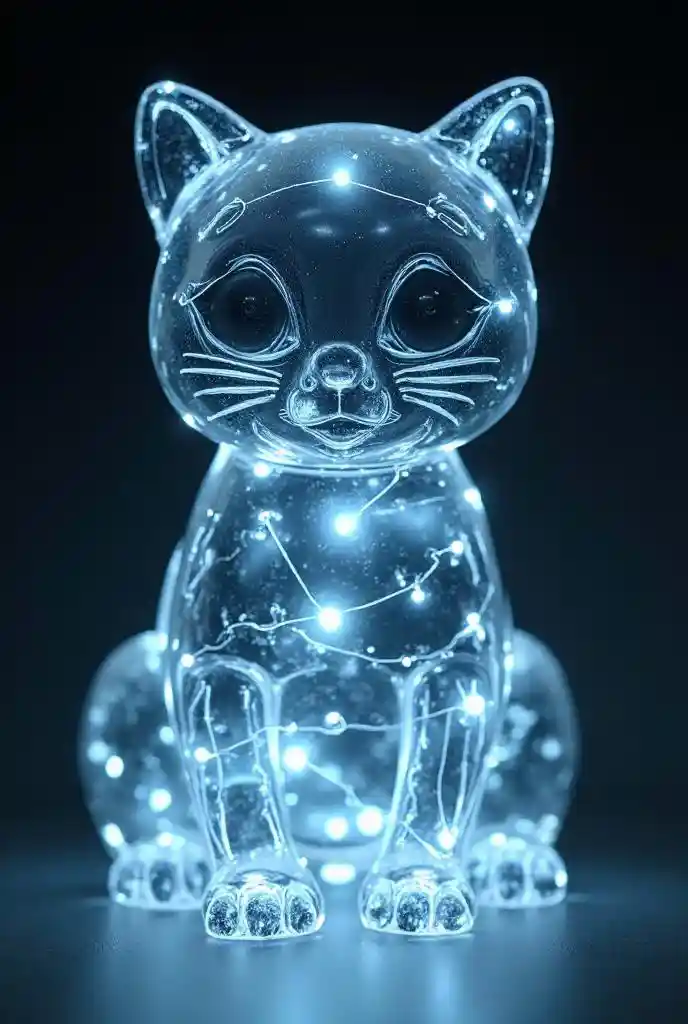 a transparent kitten made of glass , with several internal light circuits
