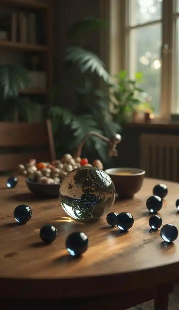 rubylynA surreal 9:16 vertical composition in a cozy room, with a realistic wooden table. Several black glass marbles are scattered on the table, one marble is being c