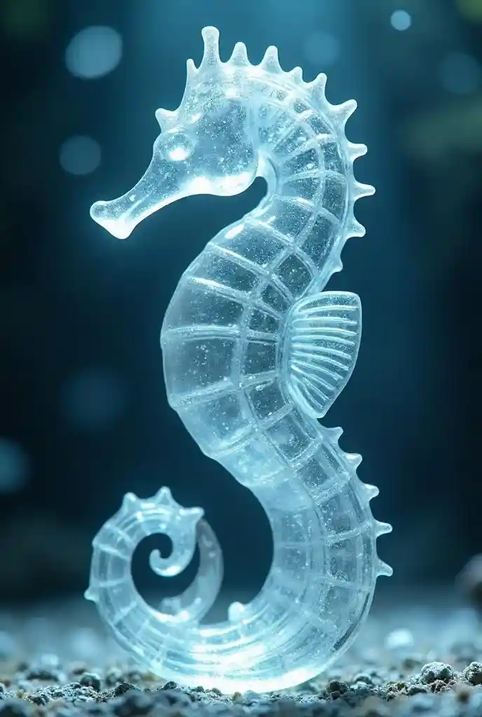 PaisleyImage of a white, transparent seahorse underwater, É made of glass transparente, Chess Piece, made of glass, completely translucent white , You can see throu