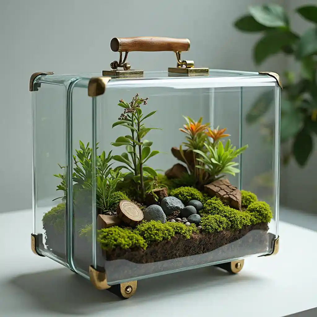 super modern transparent glass suitcase floating with a terrarium of wood, moss and other plants