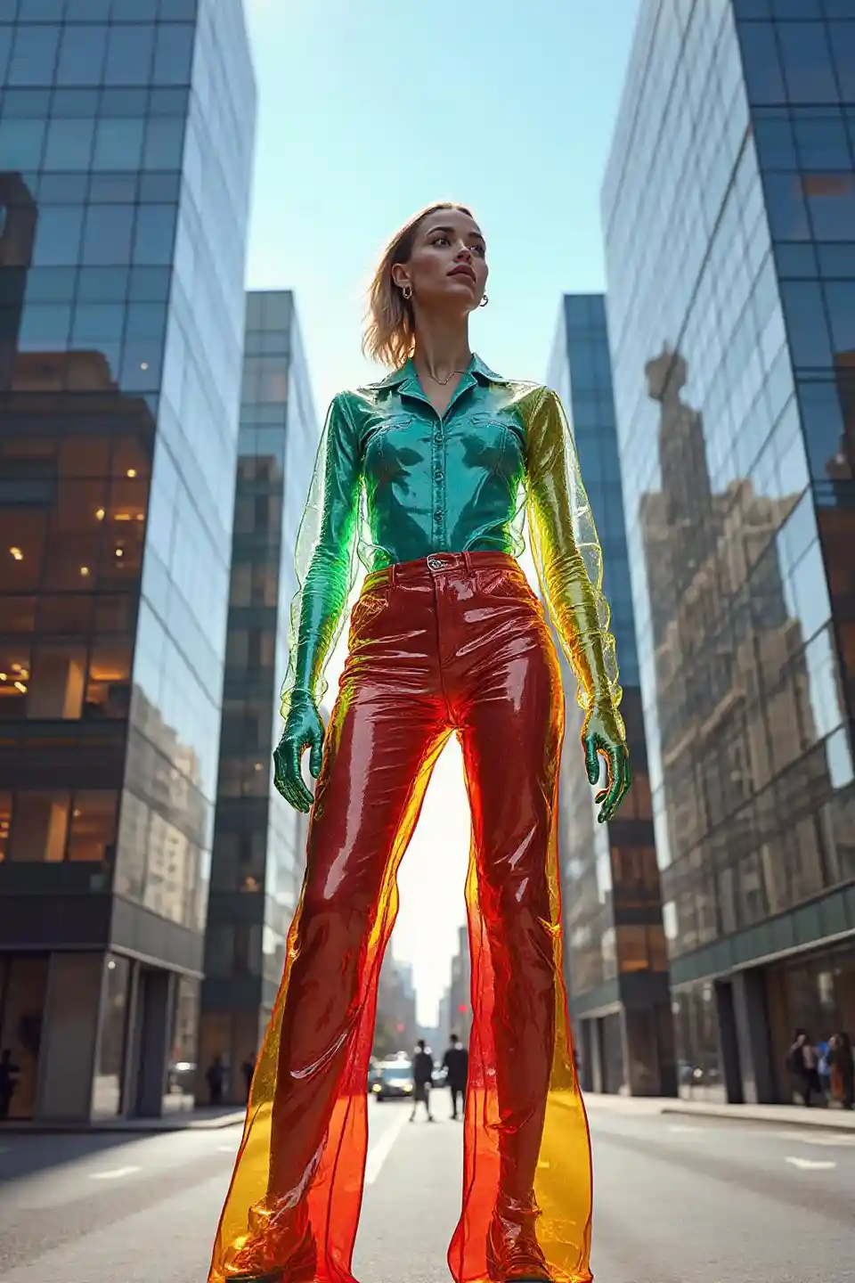 A woman wearing a rainbow-colored glass shirt, rainbow-colored glass pants, and a machine-colored arm is standing between a very tall building made of glass,Air