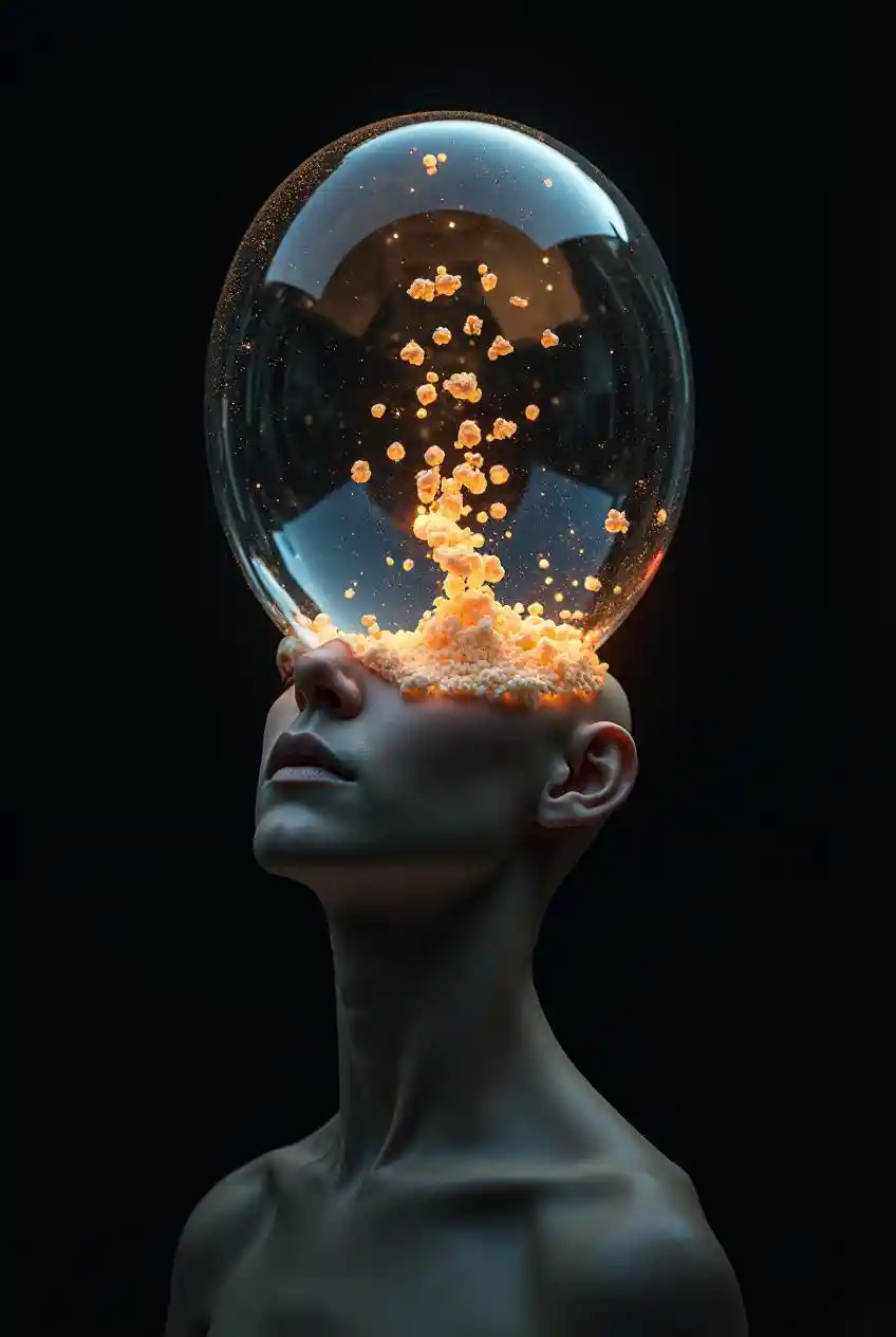 A bubble with organic glowing shapes on the inside is falling into the inside of the head of the person from the sky. Extreme realistm, highlighting the world's light. Complex composition, intricate detail, 4k. Black background.