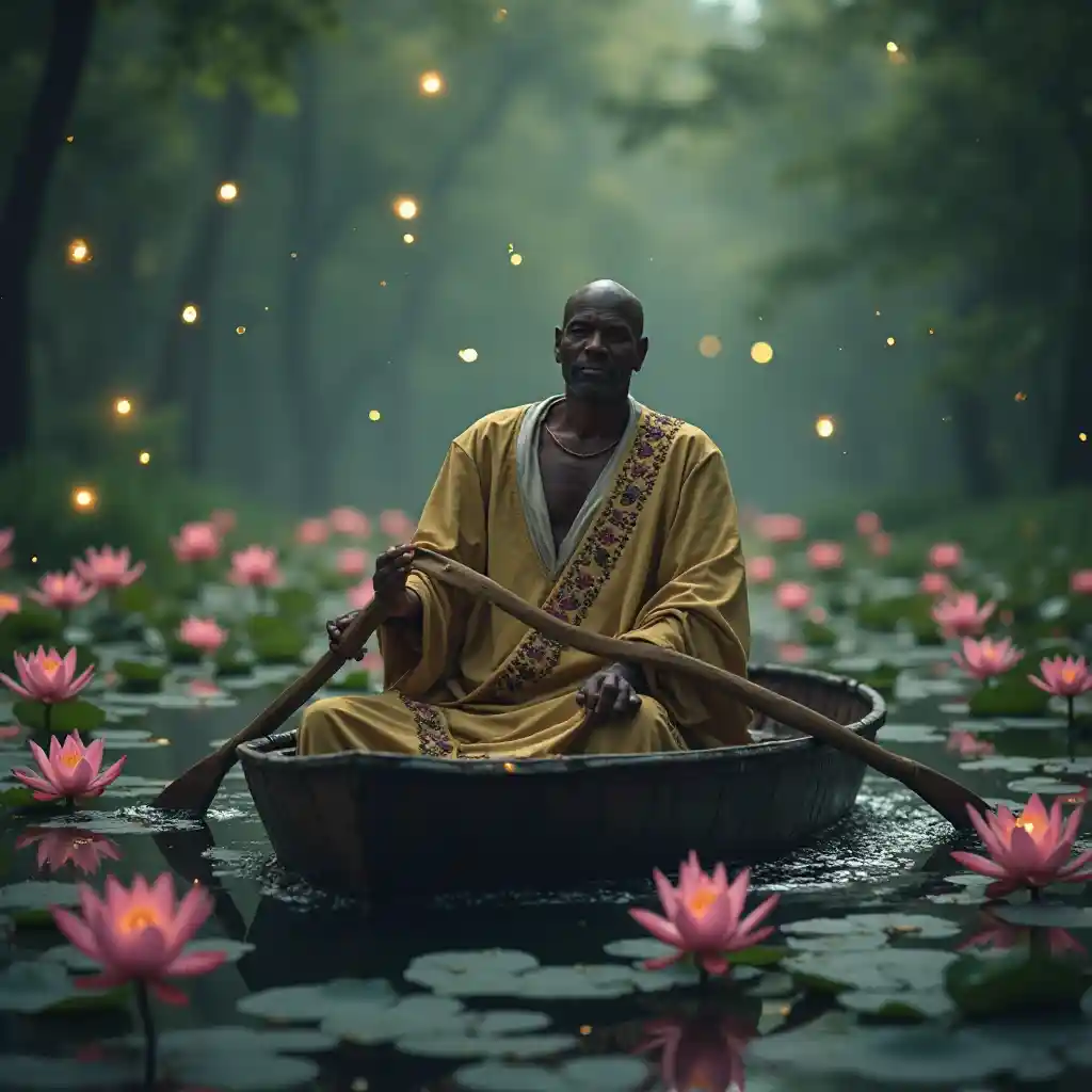 Sailing a raft in a glowing river, a 79-year-old African man with a bald head wears a tunic with wave embroidery. Fireflies and lotus blooms frame him, his steady rowing radiating serenity and natural wonder in a dreamy, fantastical setting. His calm guides the current.