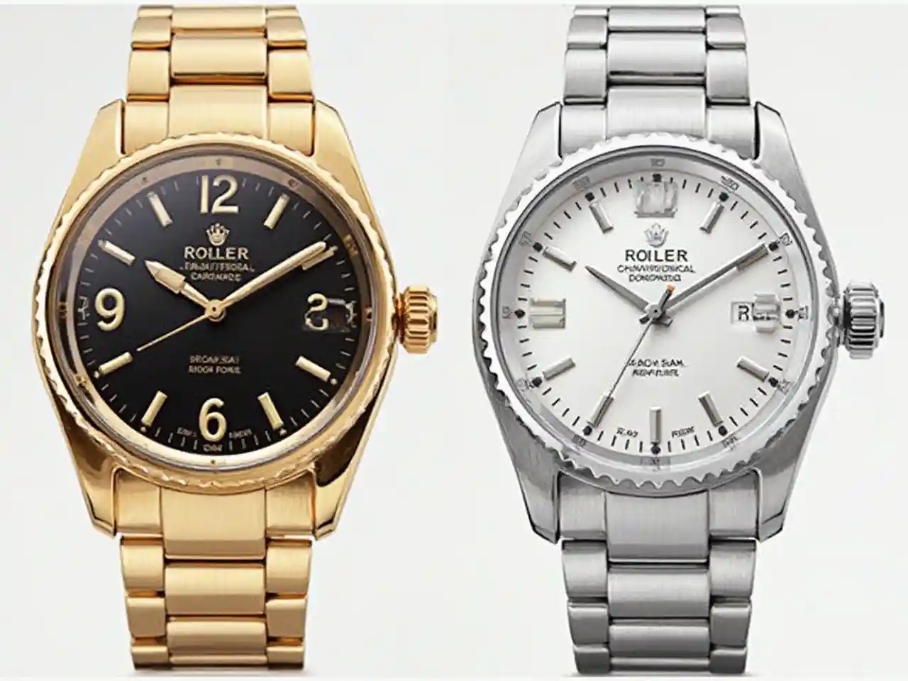 Two watches, one gold with black face, one silver with silver face, side by side.