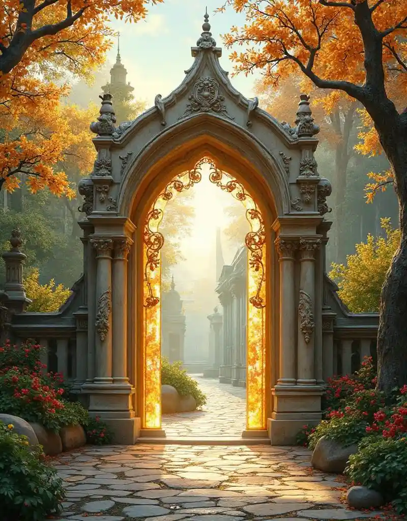 A beautiful golden city, Baroque and Gothic, many architectural objects: transparent main gates made of rock crystal, a magical garden, fruit trees, beautiful s