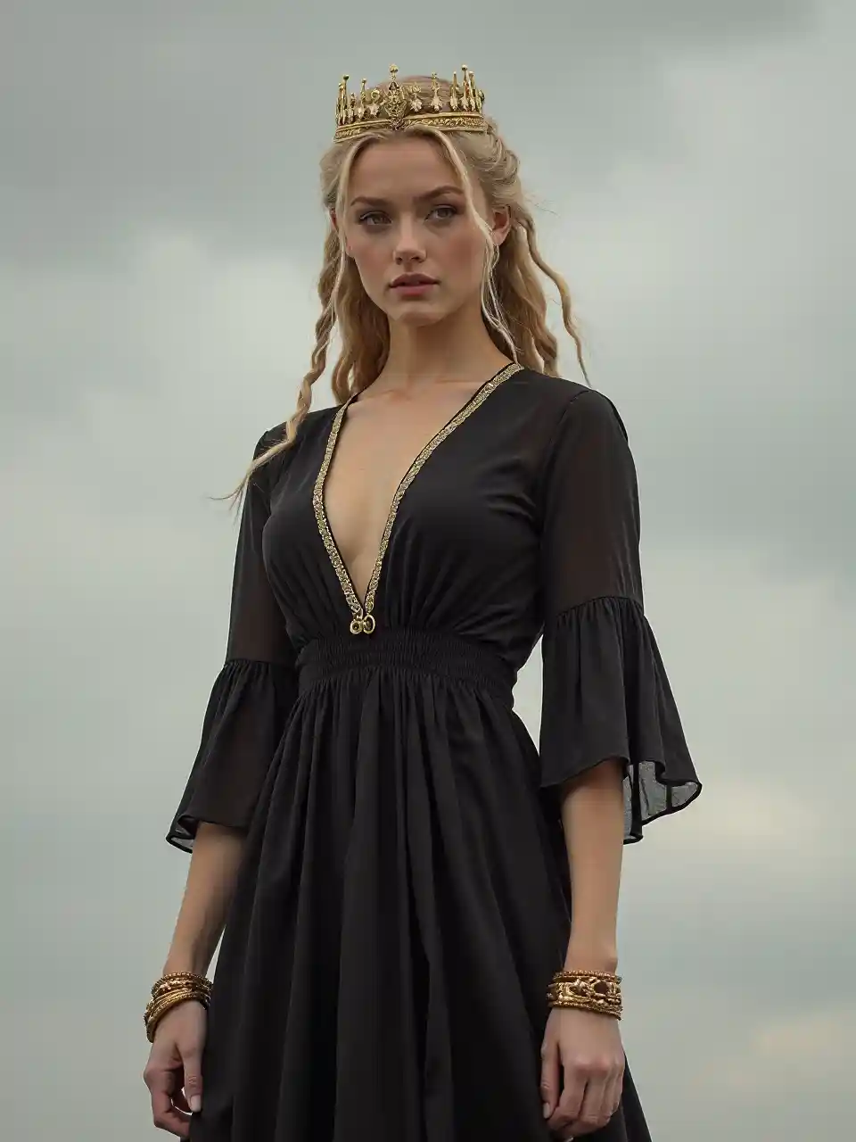 Josephblonde woman, hair with braids, thin gold crown, golden bracelets, wearing long black V-cut dress, long dress, golden details on the dress, bright yellow eyes, looking straight on, gray sky in the background