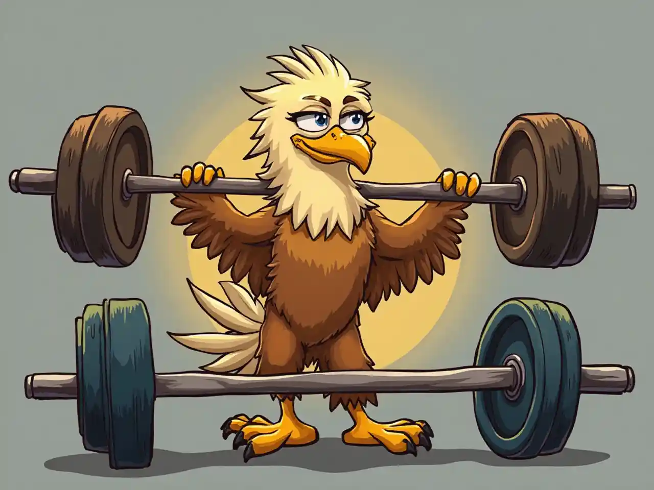 A Golden Eagle Cartoon Lifts a Heavy Barbell