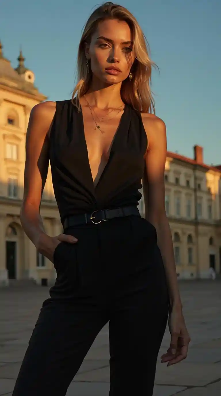 A striking image of a woman dressed in a sleek black outfit, elegantly posing in front of a grand historic building during the golden hour. The warm sunlight highlights the textures of her outfit and the architectural details of the building behind her, creating a beautiful contrast against the deep blue sky. The composition captures her confident stance and poise, blending modern fashion with timeless architecture.