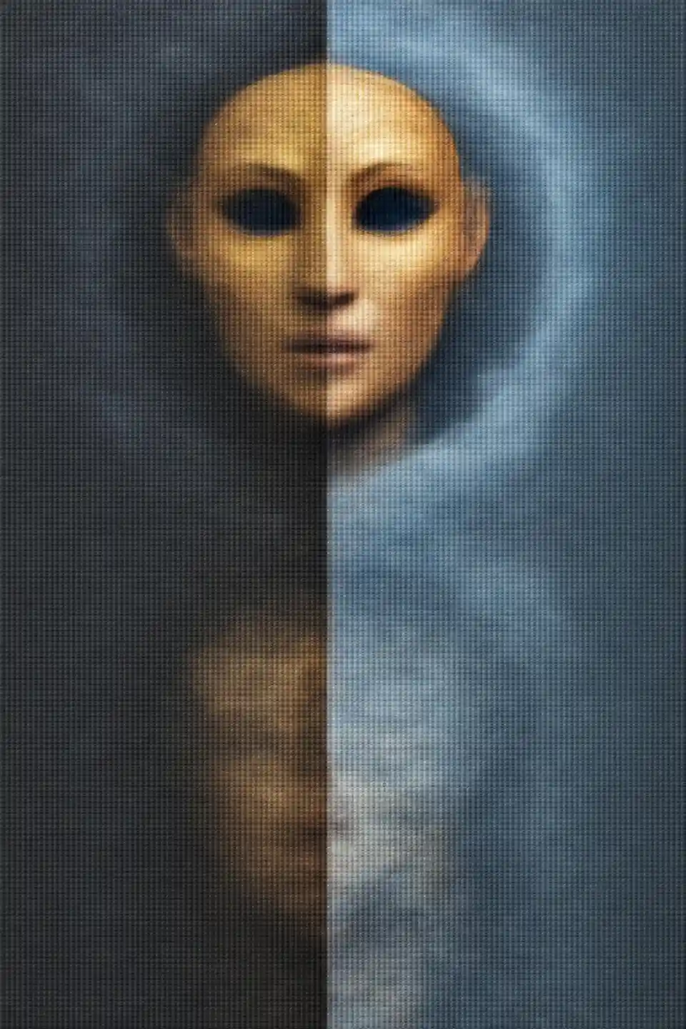 rubylynStunningly beautiful surreal portrait in ultra-realistic quality - Golden Mask in Blue Storm/ Vertical split effect:/ Left side - perfect golden mask with embos