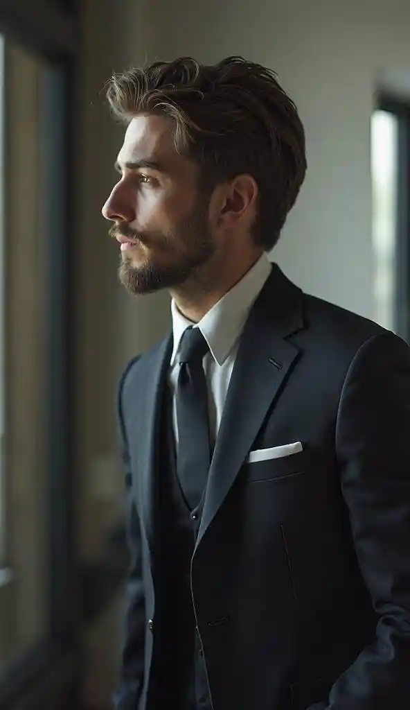 Josephultra high quality, 8k, Focus on the person, perfect configuration, proper placement in office clothes, golden ratio, from the side:1.331, masterpiece, Best