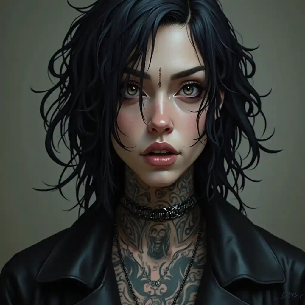 Androgynous, long black haired, goth, tattooed and facial piercings, man