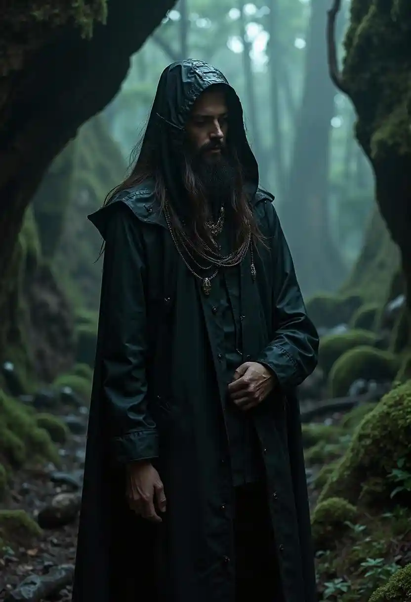 laaaaragothic, epic, Epic, gothic style, dark, dimly , damp, Spruce cave you can see light, Semi-dried bony man, with long hair, hand jewelry, raincoat black, reache