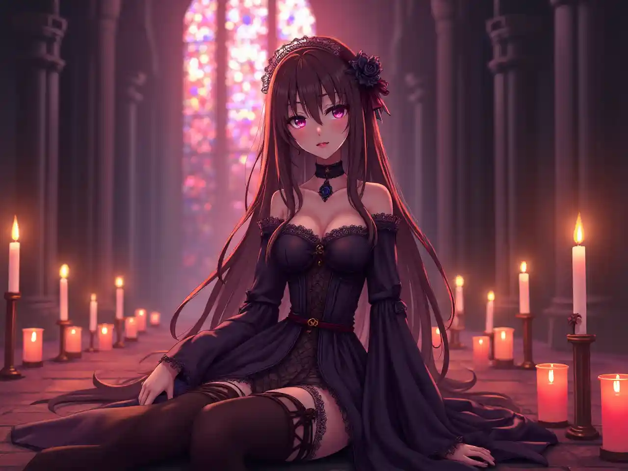 Horizontal large-scale image of an Ultra HD anime girl, stunningly beautiful and sensual, glowing under soft candlelight, sitting in an indoor gothic cathedral with stained glass windows, wearing a dark Lolita dress with a corset top and thigh-high stockings, her long hair adorned with a lace veil and a sultry smile, wide sparkling eyes, glowing skin, deep purple and red color palette, delicate features, bold makeup, sacred and ethereal vibes, warm lighting with a soft glow, emphasizing her alluring, well-defined chest with a subtle cleavage, and long, toned legs with a poised posture, radiating allure and divinity.