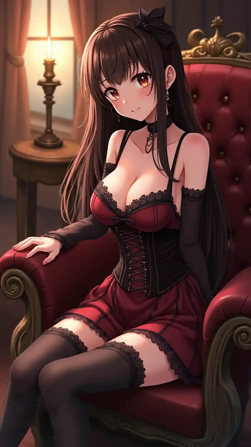 Vertical large-scale image of an Ultra HD anime girl, stunningly beautiful and sensual, glowing under soft candlelight, sitting in an indoor Victorian study with leather furniture, wearing a gothic Lolita dress with a lace-up corset and thigh-high stockings, her long hair adorned with a black ribbon and a gentle smile, big sparkling eyes, glowing skin, deep red and brown color palette, delicate features, flawless makeup, intimate and elegant vibes, warm lighting with a soft glow, highlighting her voluptuous, well-defined chest with a subtle cleavage, and long, toned legs with a poised posture, radiating allure and sophistication.