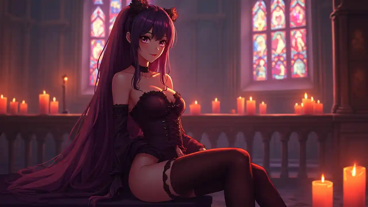 Horizontal large-scale image of an Ultra HD anime girl, stunningly beautiful and sensual, glowing under soft candlelight, sitting in an indoor gothic cathedral with stained glass windows, wearing a dark Lolita dress with a corset top and thigh-high stockings, her long hair adorned with a lace veil and a sultry smile, big shimmering eyes, glowing skin, deep purple and red color palette, delicate features, bold makeup, sacred and ethereal vibes, warm lighting with a soft glow, emphasizing her alluring, well-defined chest with a subtle cleavage, and long, toned legs with a poised posture, radiating allure and divinity.