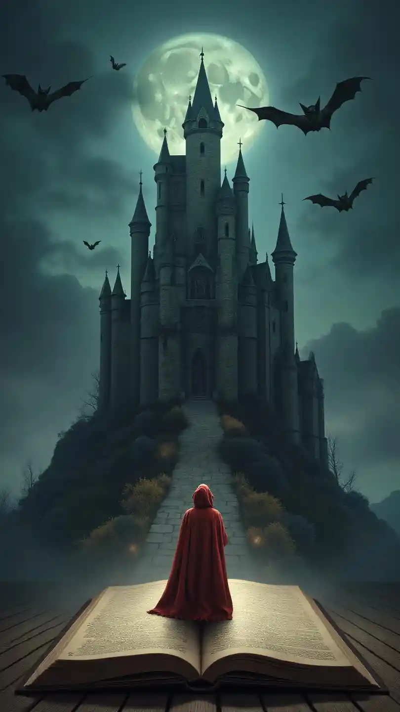 A dark gothic castle rises from the open pages of an ancient spellbook. A figure in a red cloak stands before it as bats fly in the twilight sky. Surreal scene