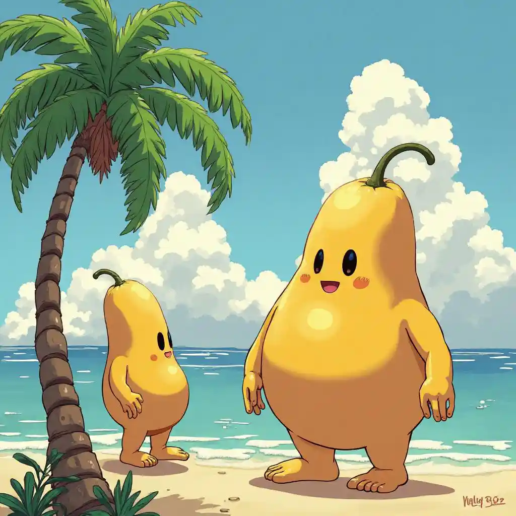 CalebHyokkori Gourd Island、deformed characters、2 people、palm tree