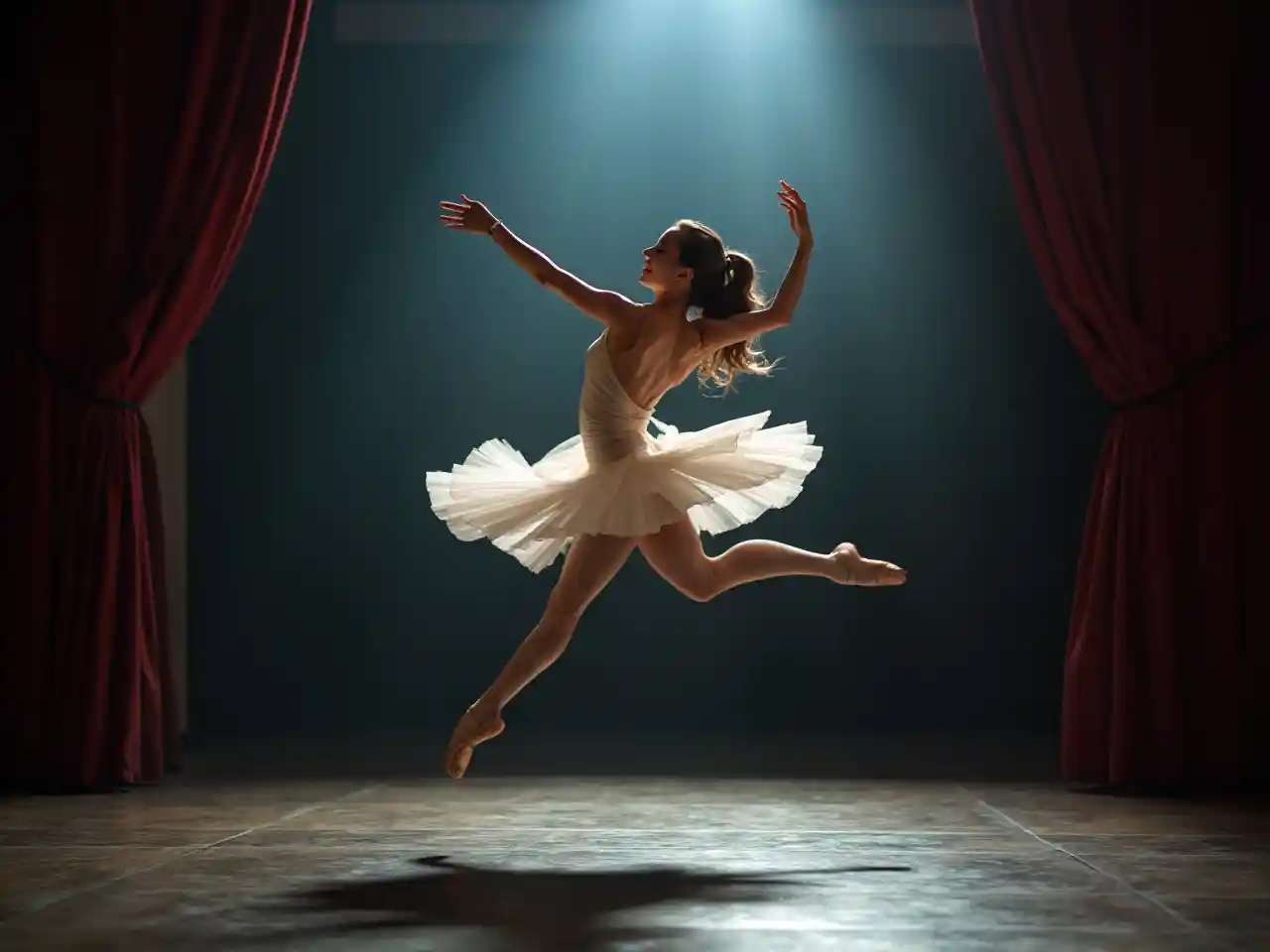 A graceful ballet dancer, @qujvm657Tso7cdB9B7DJ, is captured mid-leap, her body arched elegantly as she dances in the air. She wears a delicate, flowing tutu that billows around her, catching the soft light from above. The scene is set in a grand, dimly lit theater, with rich velvet curtains framing the stage. Subtle spotlights illuminate her form, creating a striking contrast against the dark background. The atmosphere is filled with a sense of weightlessness, as if she is defying gravity. Her arms are extended gracefully, fingers poised, and her expression reflects concentration and joy, embodying the beauty of ballet. The camera angle is slightly below, emphasizing her height and the fluidity of her movement.,