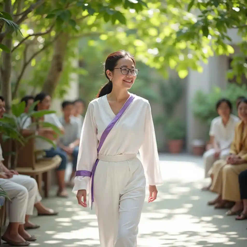 A woman gracefully walks through a bright, open space adorned with lush greenery in the background, evoking a serene atmosphere. Clad in a traditional white outfit, complete with a purple-trimmed sash, she exudes confidence and warmth, highlighted by her gentle smile and glasses. Her hair is neatly pulled back, adding to her polished appearance. The setting suggests a casual yet respectful gathering, with several individuals seated in the background, observing her presence. The natural light filters in, casting a soft glow that enhances the simplicity and elegance of the moment, reflecting a narrative of cultural pride and community connection.