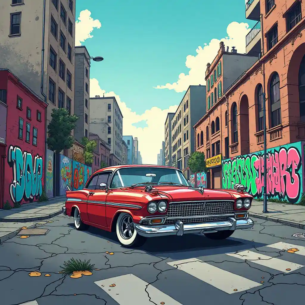 VictoriaCreate an illustration of a city with graffiti on walls and a lowrider car