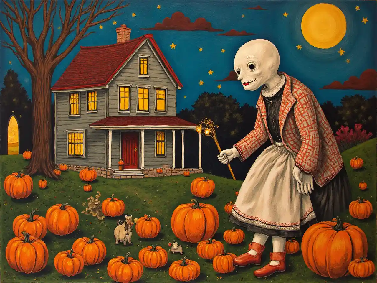 in Folk Art Style, Grandma Moses, Trick or Treat, detailed,