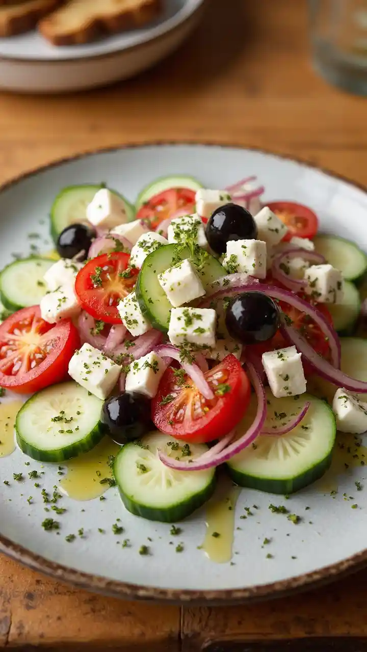 Greek Salad, small plate on a wooden table, Description: A refreshing Mediterranean salad with cucumbers, tomatoes, red onions, Kalamata olives, and feta cheese, drizzled with olive oil and sprinkled with oregano.