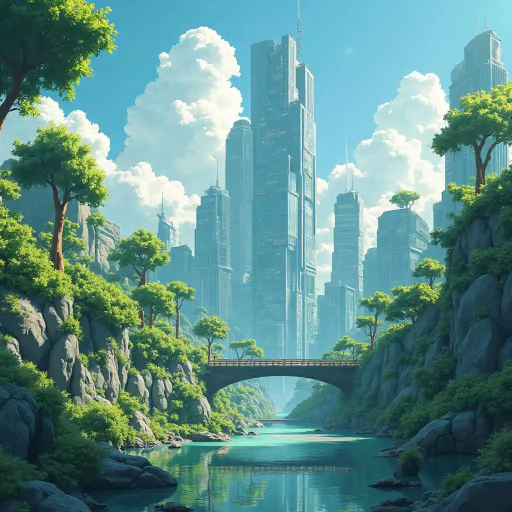 GabrielA city blending nature and tech, reminiscent of eco-anime themes.