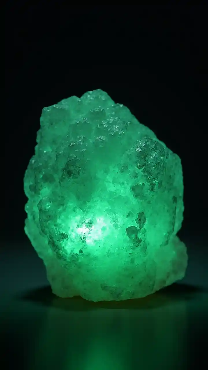 Benjaminsingle solid glowing green Rock crystal on a dark background, macro photography