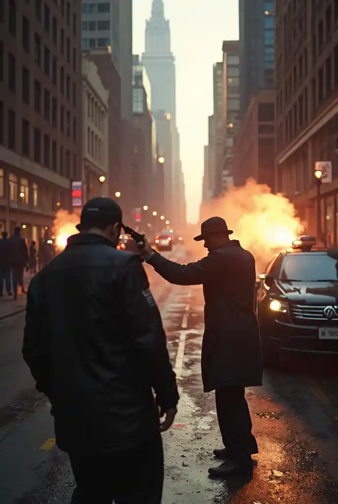 WilliamA high quality "GTA" cinematic image, UHD, high resolution, best quality, ultra-detailed, a gritty scene a firefight by gangsters in the streets of Chicago; a r