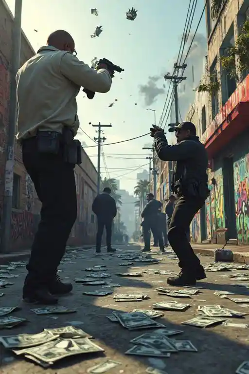 EvelynGunfight between GTA gangs and police, street fight in Los Santos, graffiti and bullet holes, wads of money strewn in high quality, 4K, realistic, photo-like, p