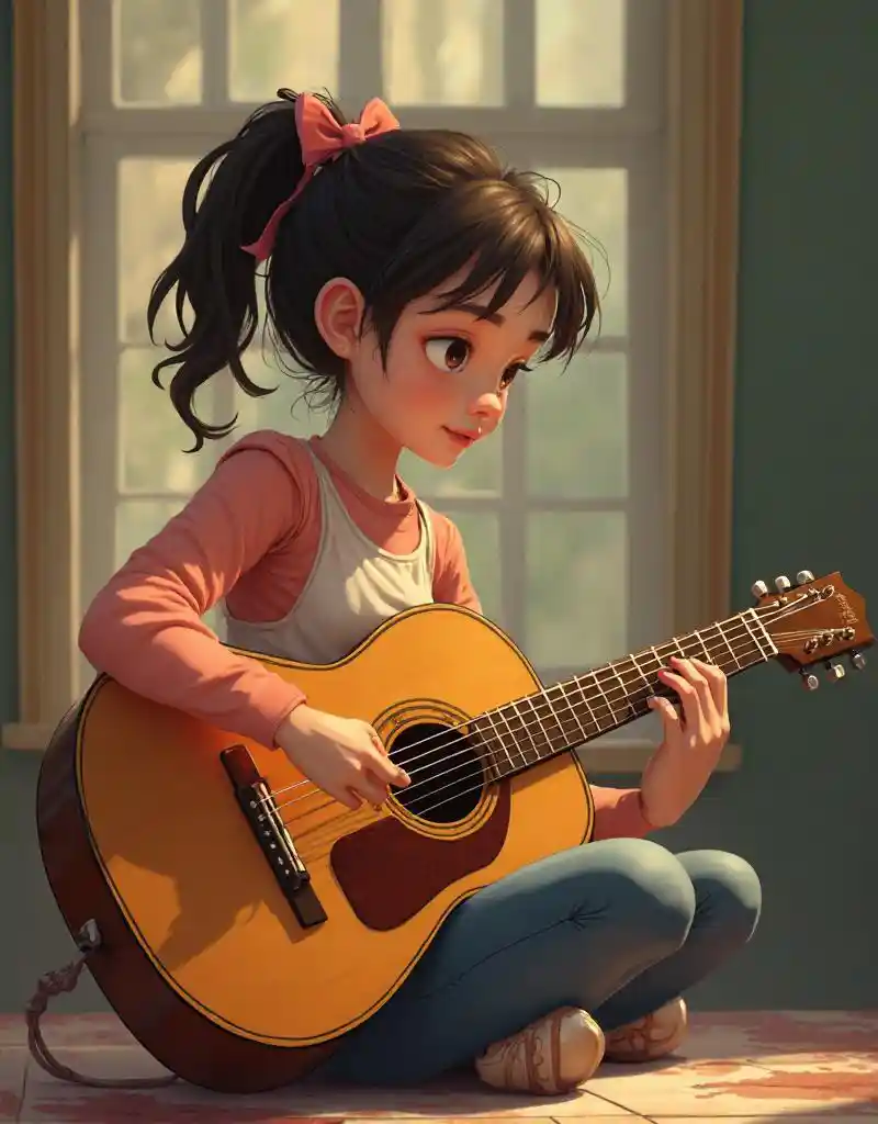 Semi-realistic animation illustration with high resolution, clear black contours, expressive shading, rich natural lighting. A young girl is playing the guitar,