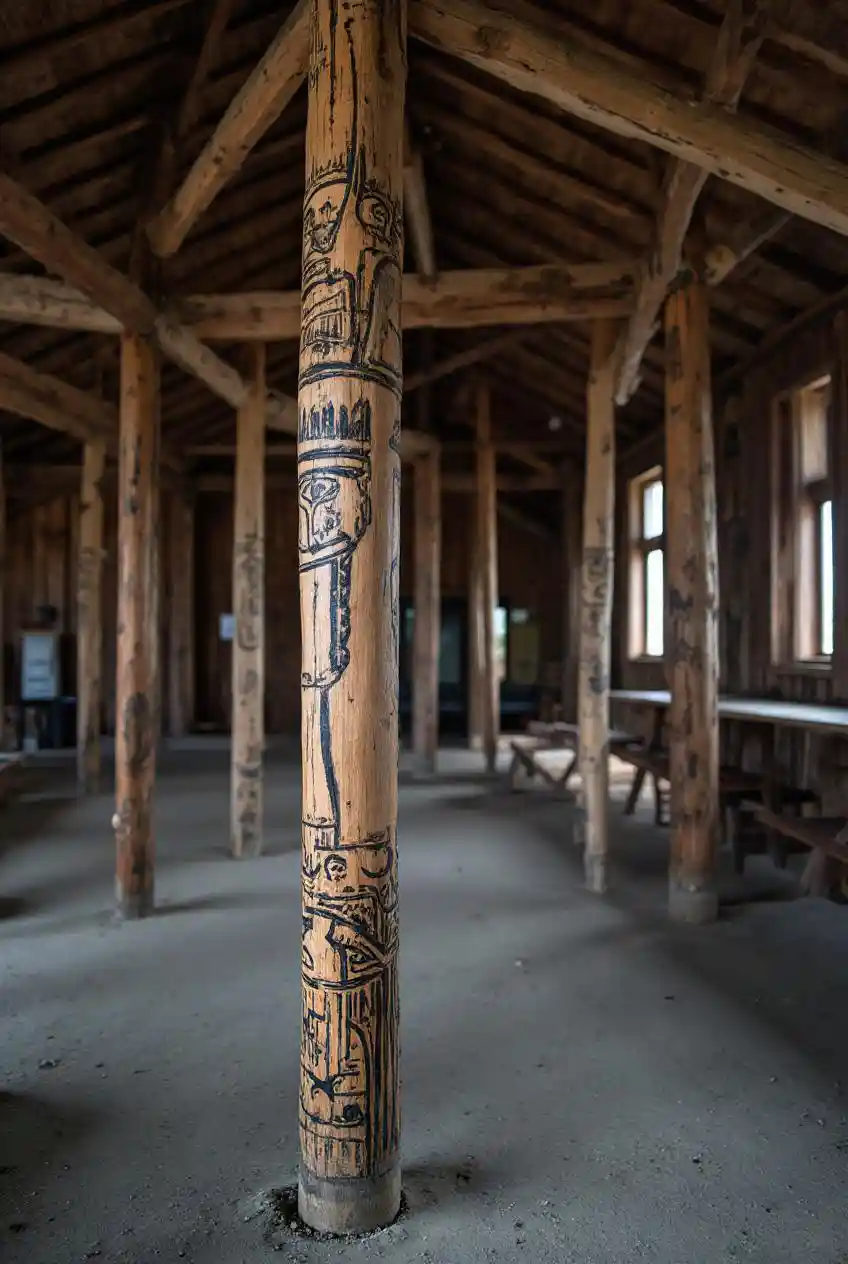 FINNNA Haida longhouse in Canada, poles inked with spirits.