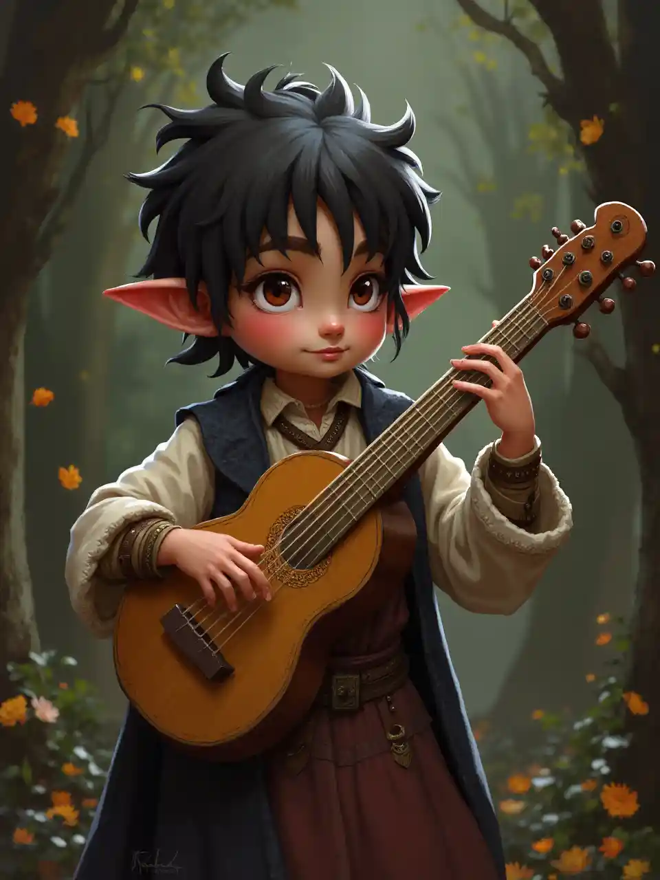 Jacknon-binary halfling bard playing the lute