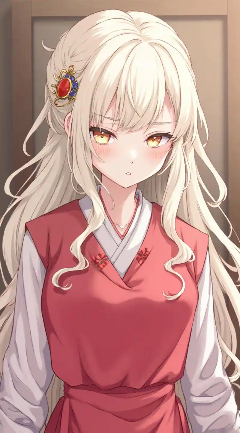Harper1 female, girl, pretty face , long wavy hair,norigae ear ring, bright hair , white blond hair,Messy Hair,bangs, reddish brown eyes, red hanbok, jewelry, sk
