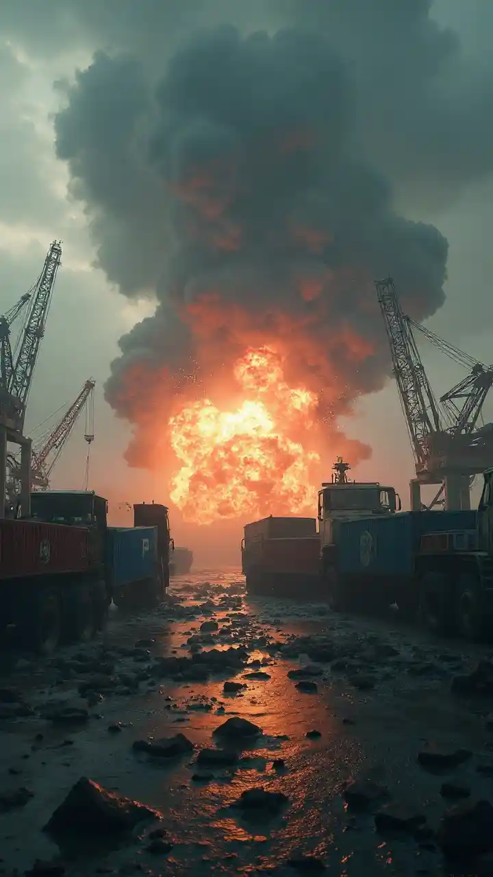 Dramatic Explosion Scene at a Chaotic Busy Harbor