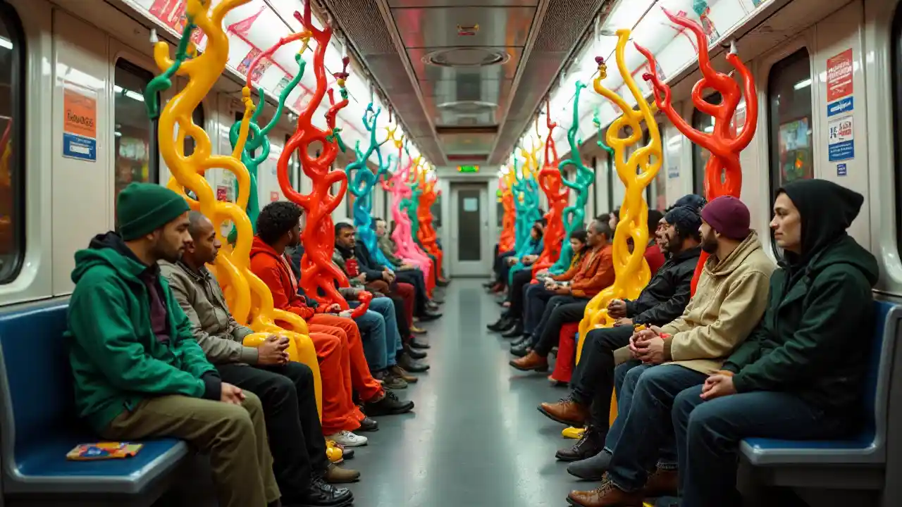 giant acrylic plant toys of vibrant colors inspired by Keith Haring in the middle of a Metro train with some people homeless