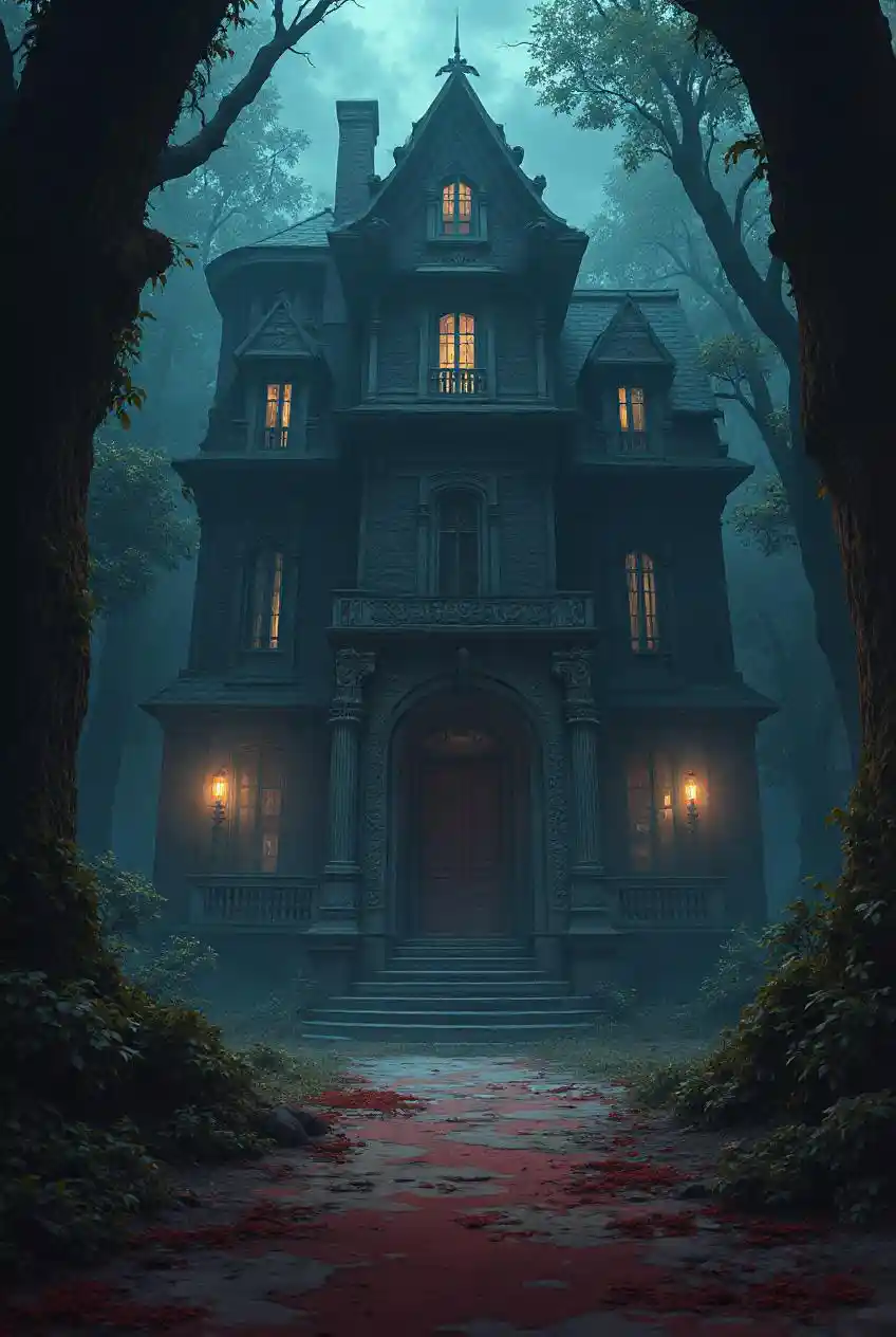 Sprawling mansion, hidden rooms with cursed artifacts, channeling dark mystery anime vibes.