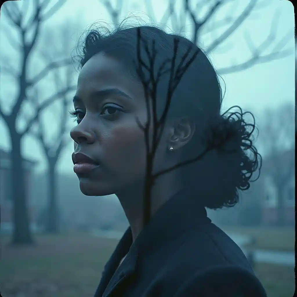 Explore the haunting beauty of double exposure photography with this captivating portrait of a young black woman beginning college is 1945. The image is pensive face overlaid with the bare branches of a tree, outside of a dorm. creating an introspective and melancholic atmosphere. The cool blue tones add to the overall moody feel, while mixed reality technology brings depth and realism to the composition. This photo was captured on Zenit 11, Helios 44 film grain camera, further enhancing the artistic expression of this stunning image.