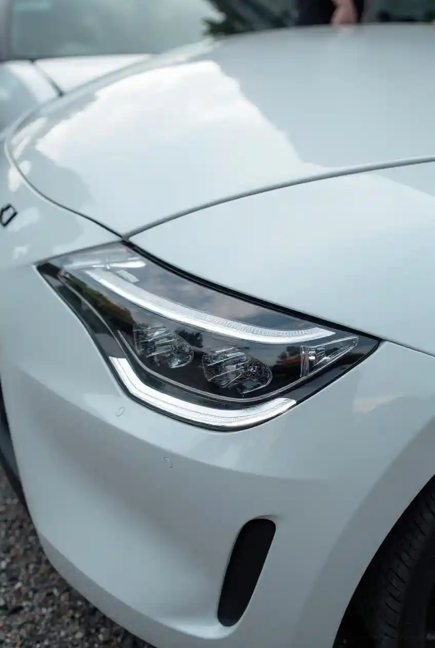 Close-up of a white car with a sleek and modern heart-shaped headlight, slightly foggy lens for a textured look, minimalistic background, focusing on the headlight design and its seamless integration into the car's body, soft natural lighting highlighting the curves.