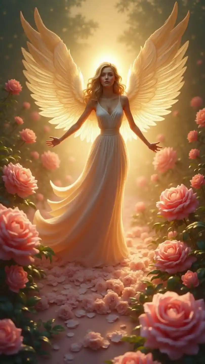 EleanorDivine angel, ethereal beauty, surrounded by blooming roses, petals glowing with sacred light, luminous golden aura, radiant and heavenly, soft sparkling ambian
