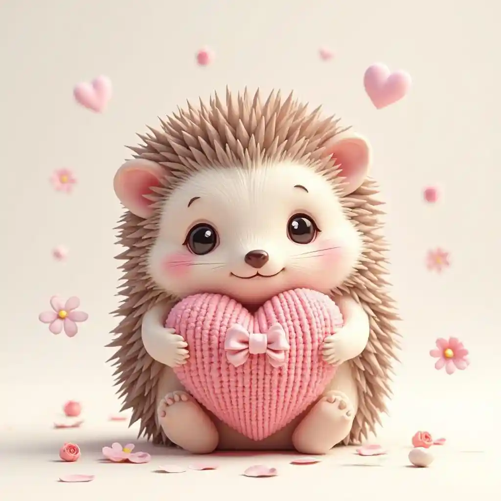 Create an ultra-detailed chibi blind box animal design featuring a shy hedgehog. The hedgehog should be holding a tiny, hand-knitted heart pillow in soft, warm pink tones. The heart pillow should have intricate stitching that enhances its charm. The hedgehog’s spines should appear soft and fluffy, blending seamlessly with a resin gloss for a unique tactile effect. The figure should be rendered in ultra-high-definition, showcasing the delicate knit texture and the glossy eyes of the hedgehog. For a more magical and collectible touch, include a tiny, delicate bow or ribbon on the hedgehog’s head or heart pillow. Surround the hedgehog with whimsical pastel-colored floating elements, like tiny flowers, stars, or hearts, to create a dreamy and enchanting atmosphere. Add a subtle, soft glow around the heart pillow, with light glitter effects on the hedgehog’s spines to enhance its charm. The hedgehog should be posed on a simple white backdrop, with soft lighting that emphasizes every detail, from the delicate knit texture of the pillow to the glossy reflection in its eyes. Additionally, include a faint reflection of the hedgehog on the surface, giving depth to the image without disturbing the softness of the fluffy style. This image should cover 90% of the page, highlighting the hedgehog as the centerpiece in an intricate and collectible masterpiece
