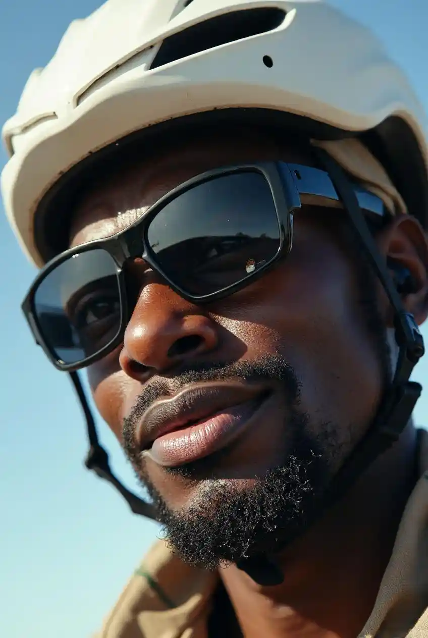 Extreme close-up of an African man wearing a white helmet and black sunglasses, reflecting the sky. Cinematic shot, natural light, in the style of Ando Fadathander. Hyper-realistic, with water drops on the glasses. Sunny day, daylight, sunrays.