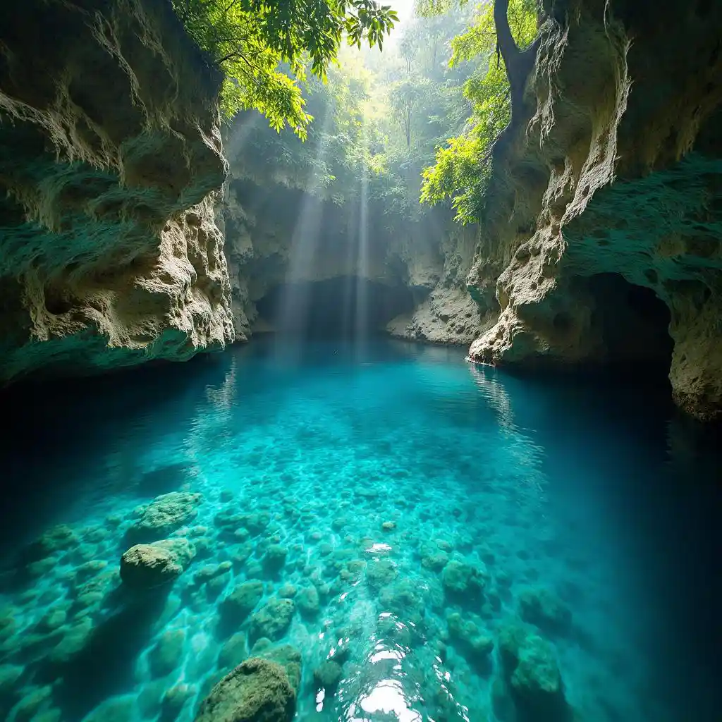A massive crystal-clear cenote, hidden deep within a tropical jungle.