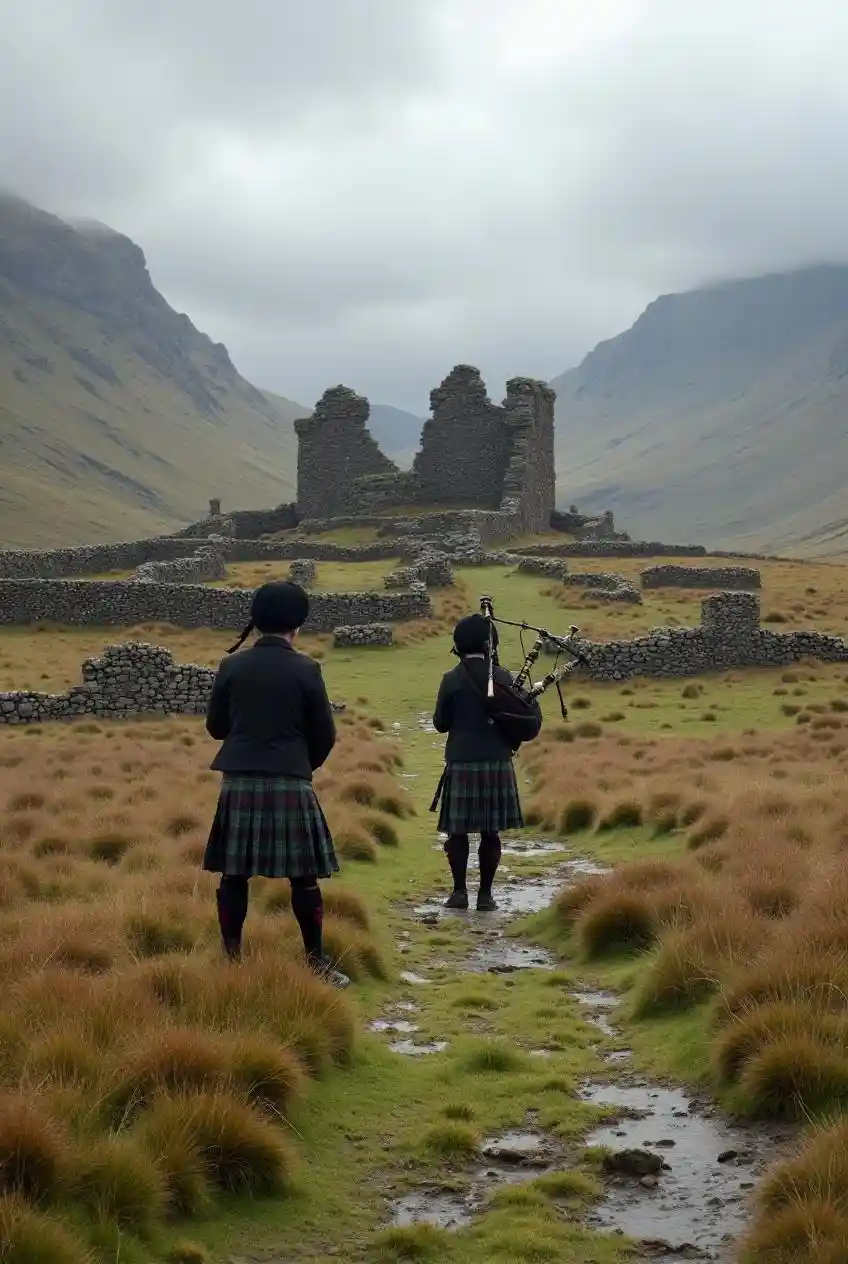 Scottish highlands, with lone bagpipers playing among stone ruins.