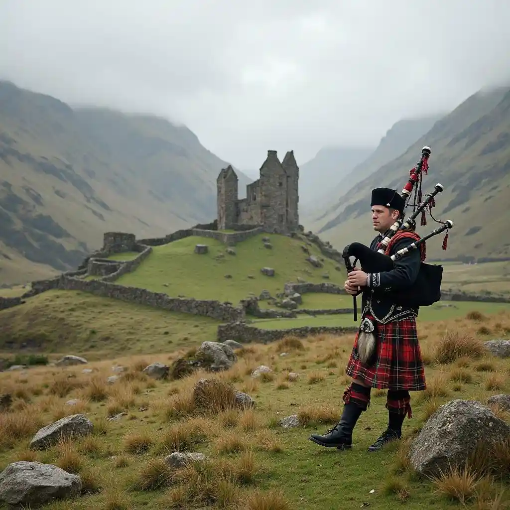 Scottish highlands, with lone bagpipers playing among stone ruins.
