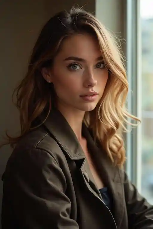 , places natural highlights on the subject's hair and jacket, It has a smooth finish that captures ambient light coming through a window. to establish spatial c