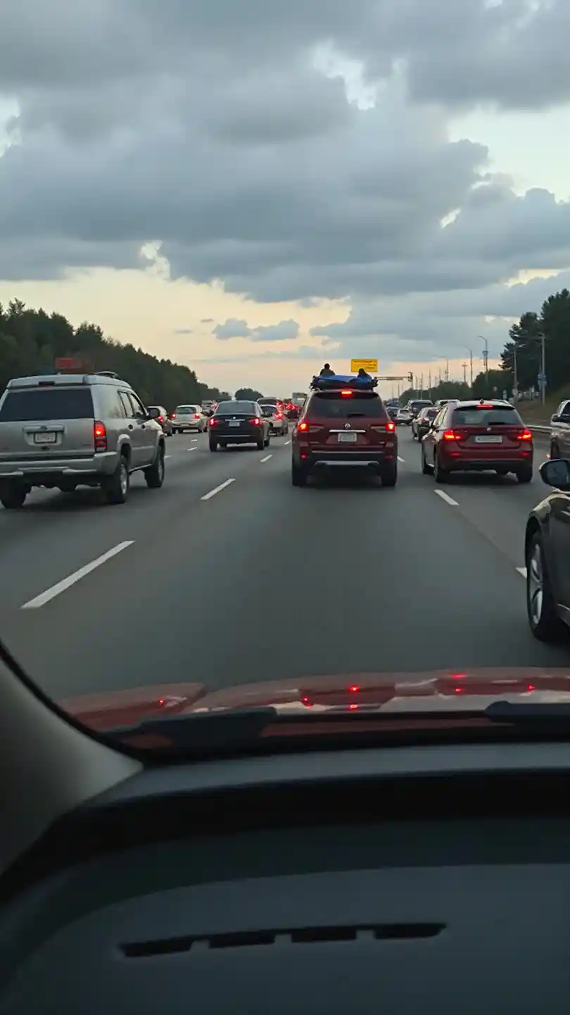 The image depicts a bustling highway scene at dusk, with a multitude of vehicles traveling in both directions under a cloudy sky.