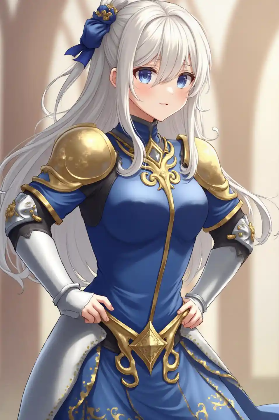 Kittylooking at viewer,close-up,blurry background、full body、Blue and gold color scheme、Beautiful decoration、 female knight、 Gold、long hair、blue eyes、 Himeji Knight、L